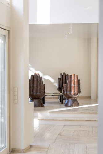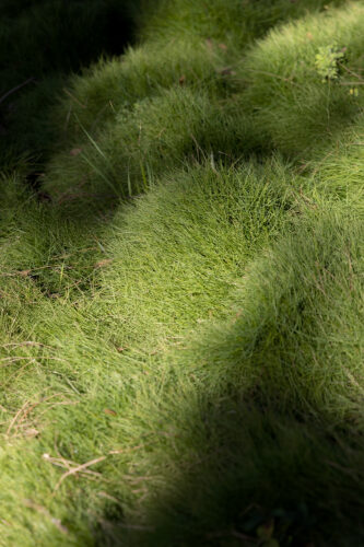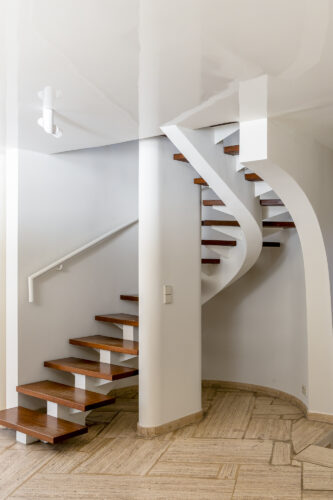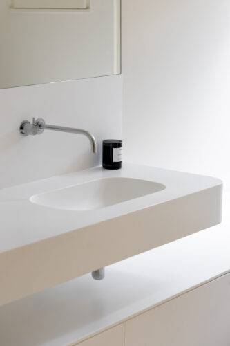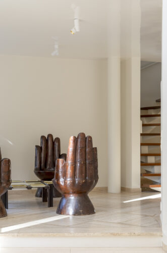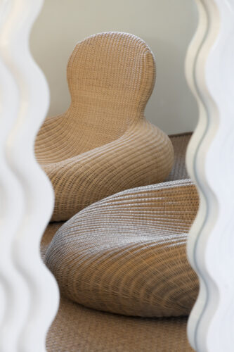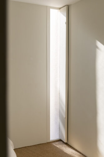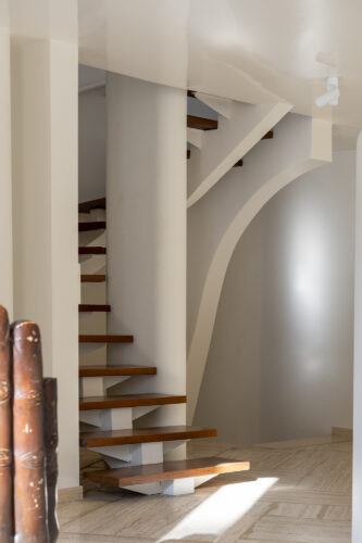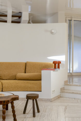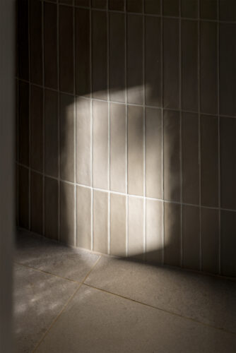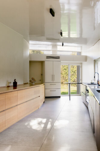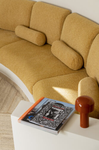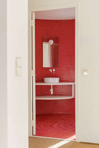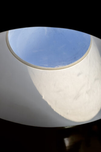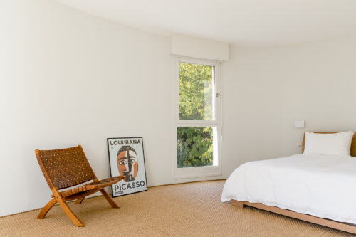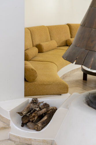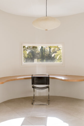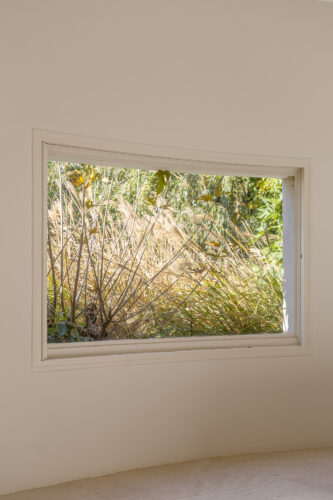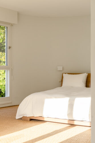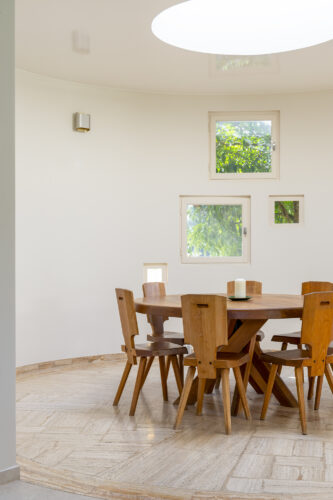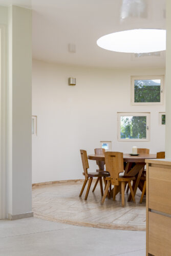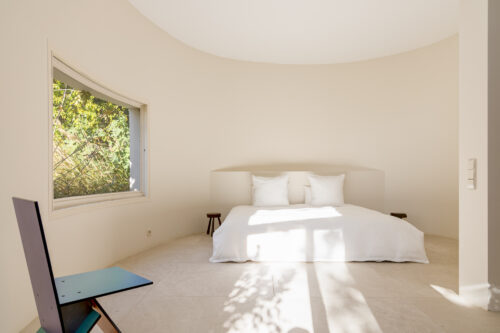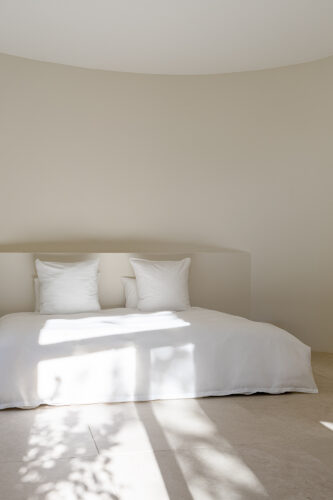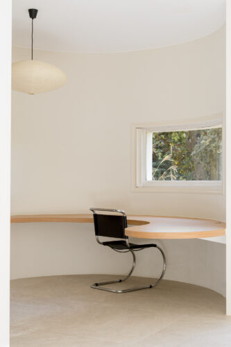 À l’intérieur, les espaces se succèdent sans angles droits, créant un parcours doux et intuitif. Les pièces, toutes différentes, alternent entre volumes ouverts et espaces plus intimes, rythmés par des jeux de lumière changeants au fil de la journée.