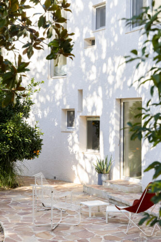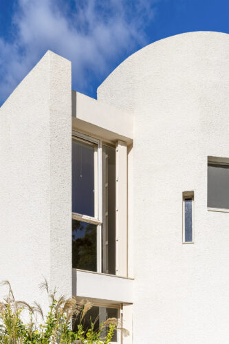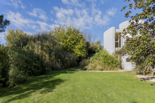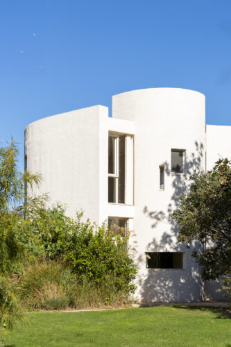 La silhouette blanche se compose de courbes, de pleins et de vides, de terrasses et de patios qui invitent à vivre dedans comme dehors. Orientation et ouvertures ont été soigneusement étudiées pour capter la lumière du sud, préserver l’intimité et dialoguer avec l’environnement. Chaque fenêtre devient un point de vue sur la nature.