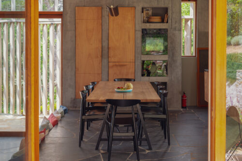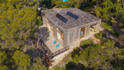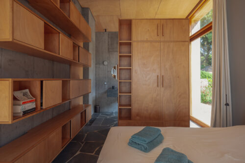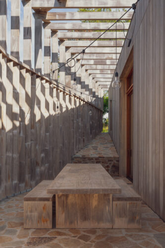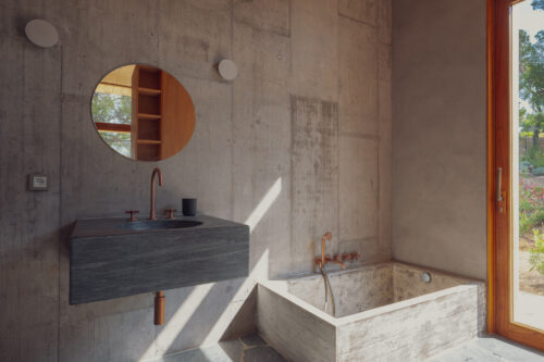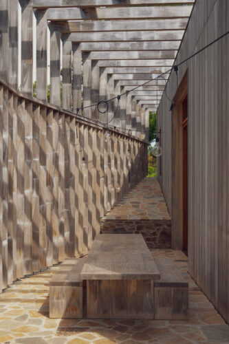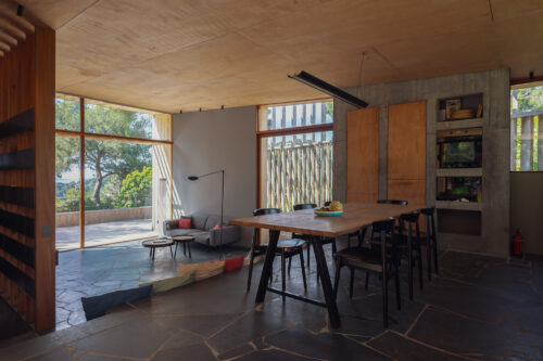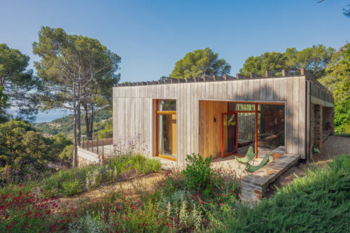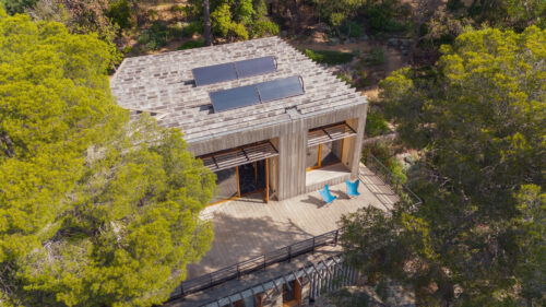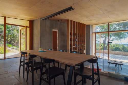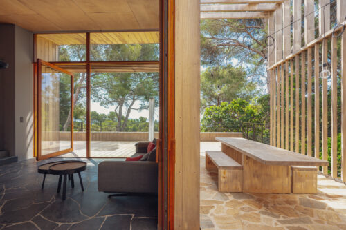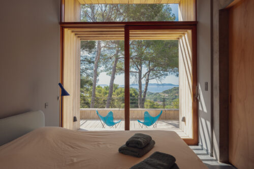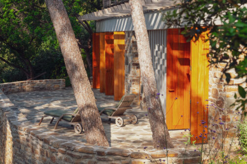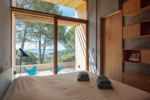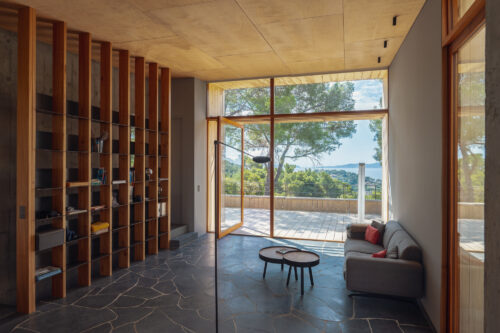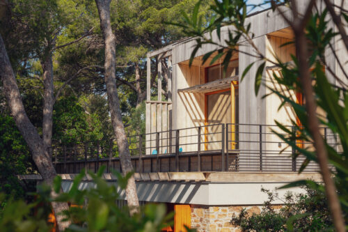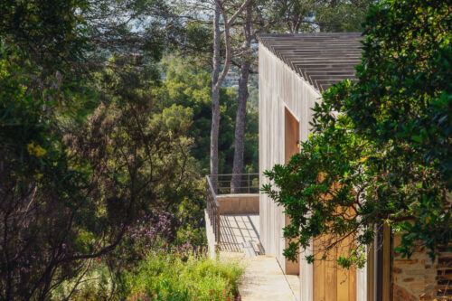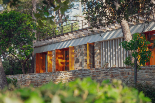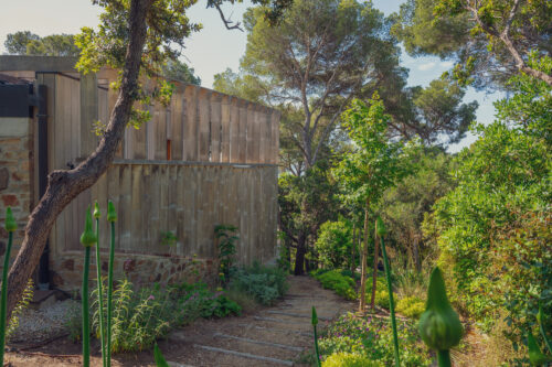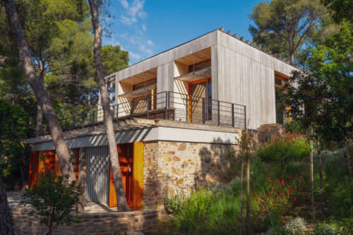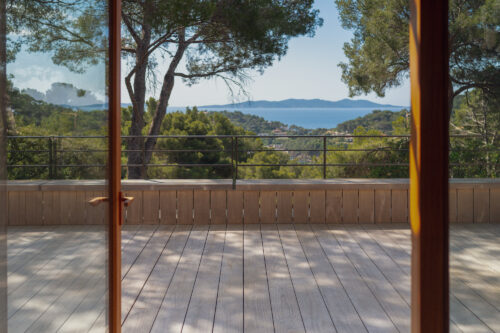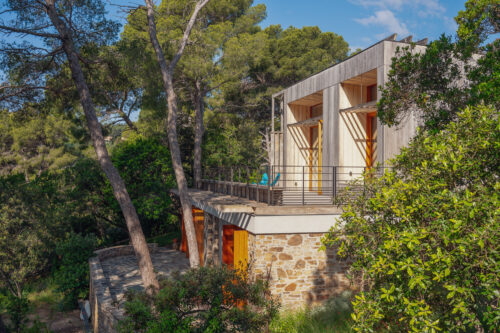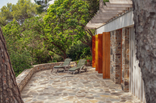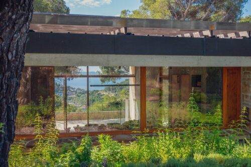 Les espaces de la villa sont largement ouverts sur la mer, les terrasses et la végétation. Son architecture se fond dans la végétation environnante, rendant la maison quasiment imperceptible dans le paysage. Son dessin architectural se fait l’expression de la nature massive des matériaux employés – la pierre locale, le bois et le béton. L’architecte a mené ici un véritable travail d’implantation de l’extension dans la pente et sans dénaturé le bâti existant.