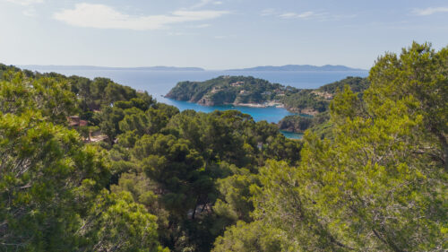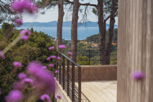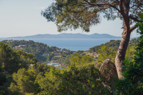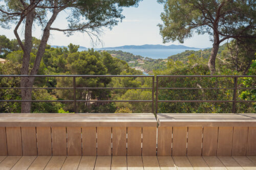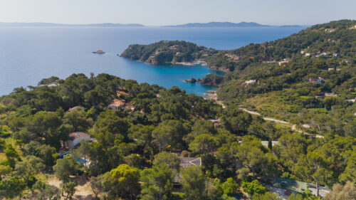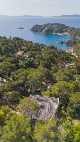 Bercée par le bruit des vagues, la villa profite d’un magnifique terrain sauvage et endémique avec une exposition Sud et une merveilleuse vue mer sur la pointe du Cristaou, Port Cros et le port du Pradet.