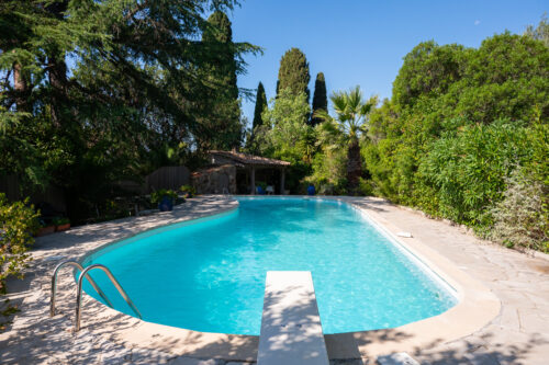 Le tout est déployé sur un somptueux parc paysager de 3 691 m², planté d’essences méditerranéennes et d’arbres centenaires. Une piscine de 16 x 4,50 mètres, accompagnée de son pool house, est idéalement nichée à l’abri des regards pour garantir une intimité totale.
